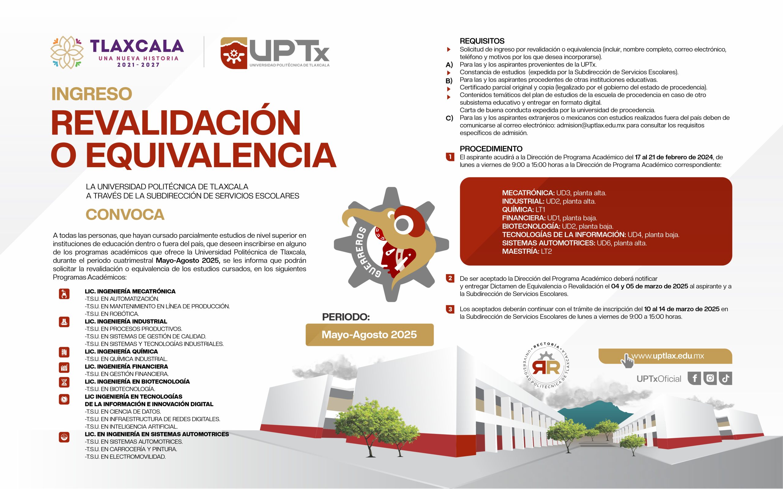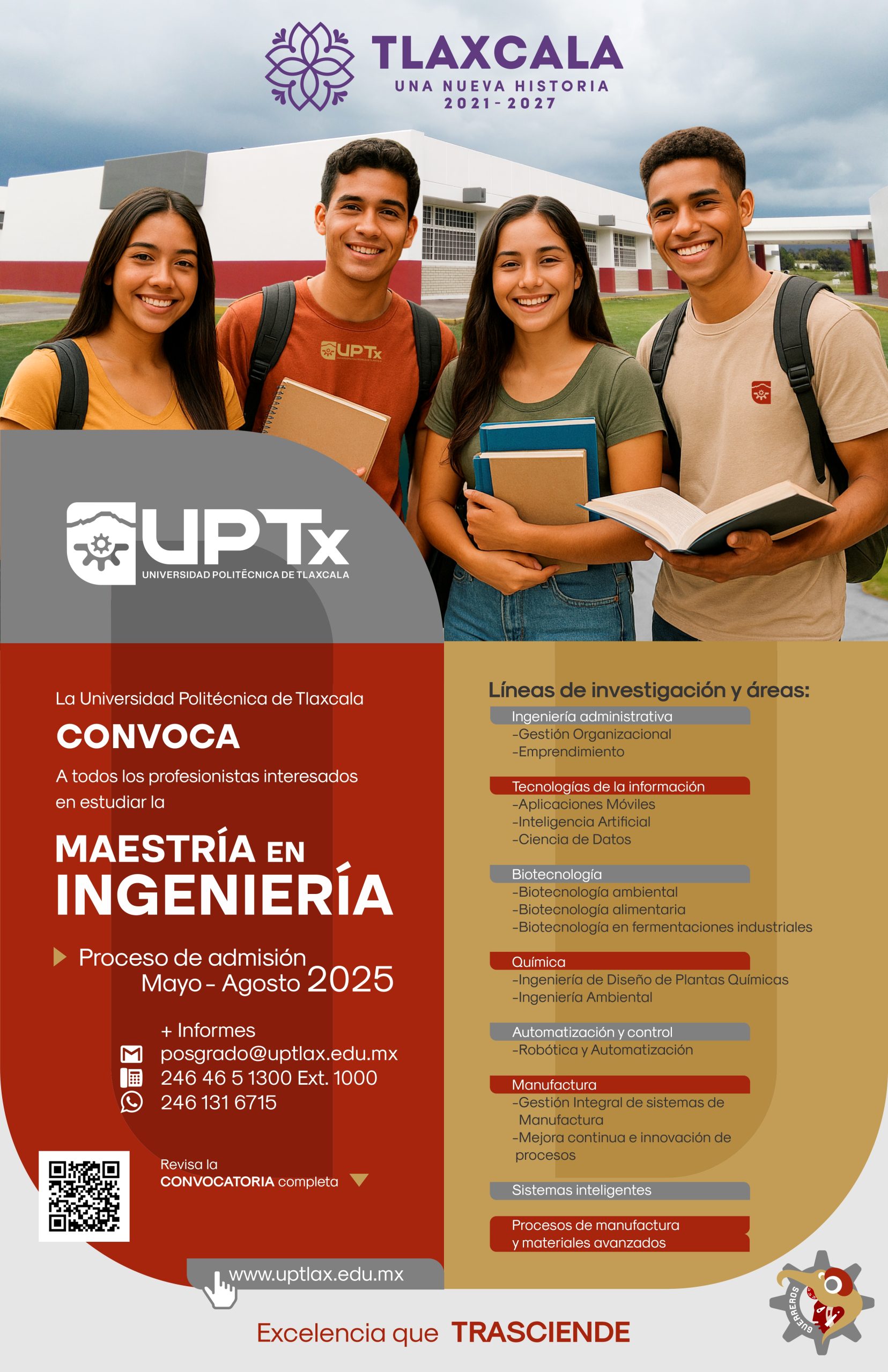 La Universidad Politécnica de Tlaxcala (UPTx) es una institución con un fuerte compromiso social. Actualmente ofrece siete Programas Educativos en Ingeniería: Biotecnología, Química, Financiera, Tecnologías de la Información, Industrial, Mecatrónica y Sistemas Automotrices. Contamos con Maestría en Ingeniería.