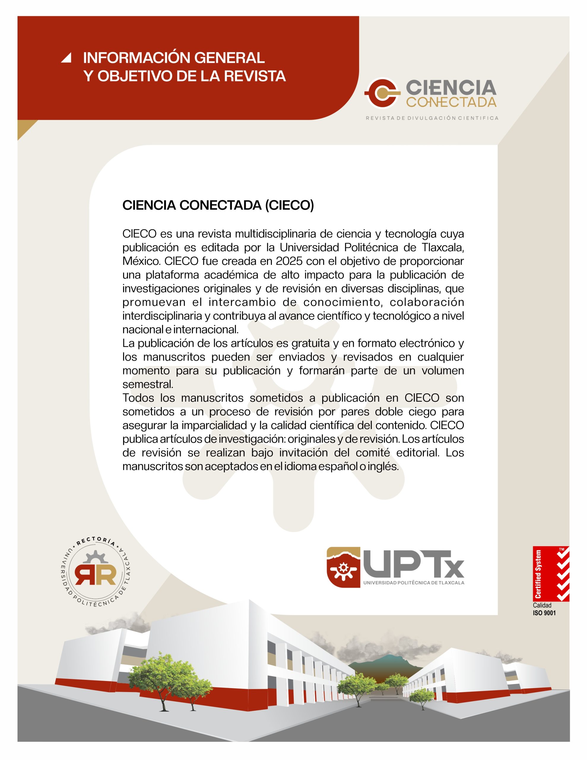 CIECO es una revista multidisciplinaria de ciencia y tecnología, editada por la Universidad Politécnica de Tlaxcala, México, y fundada en 2024. Su propósito es ofrecer una plataforma académica de alto impacto para la publicación de investigaciones originales y artículos de revisión en diversas disciplinas, fomentando el intercambio de conocimiento y la colaboración interdisciplinaria, y contribuyendo al avance científico y tecnológico a nivel nacional e internacional.