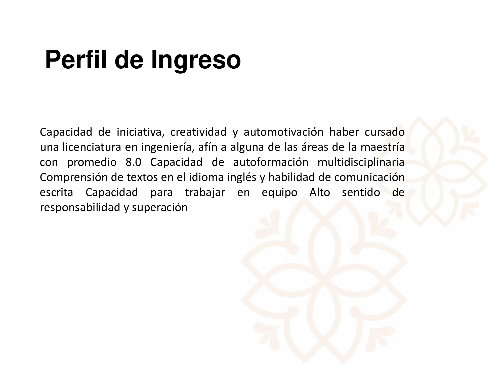 | Perfil de Ingreso | El aspirante en Ingeniería en Sistemas Automotrices debe contar con las competencias del nivel medio superior en matemáticas, física, química y computación; además de habilidad para el manejo de instrumentos y equipos de laboratorio: así como tener capacidad de trabajo en equipo con actitudes de liderazgo, comunicación asertiva y actuación constante. |